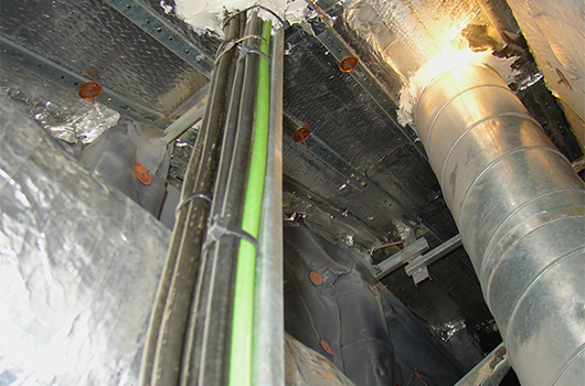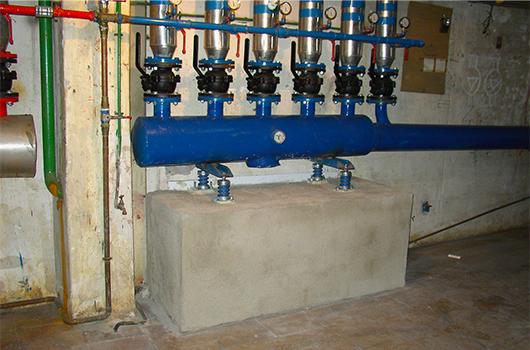 Con bombas de circulación de agua, fijaciones y pasamuros de tuberías rigidos.